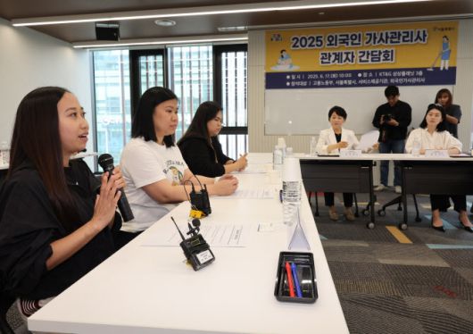 성동구 KT&G 상상플래닛에서 열린 ‘외국인 가사관리사 간담회’에서 외국인 가사관리사 자스민 에리카 씨가 발언을 하고 있다. (사진=연합뉴스) |