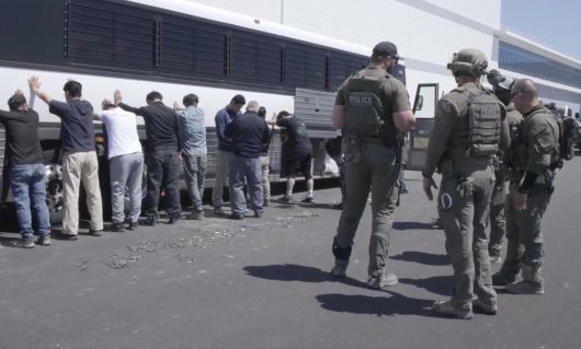 4일(현지 시간) 미국 조지아주 서배너의 현대차그룹-LG에너지솔루션 합작 배터리공장 건설 현장에서 이민세관단속국(ICE) 요원들이 불법 체류 혐의를 받는 한국인 공장 직원들을 버스에 양손을 짚게 하고 일렬로 세워놓은 모습. 요원들은 이들의 양손과 다리를 쇠사슬로 묶어 약 170km 떨어진 포크스턴 구금소 등으로 이동시켰다. 이 구금소는 오래전부터 열악한 환경으로 비판받았던 곳이다. 사진출처= ICE 홈페이지 |