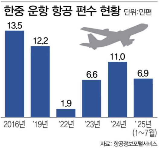 아직 코로나19 팬데믹 이전 대비 90% 수준인 운항 항공편도 중국인 방한 수요 회복의 제약 요인이 되고 있다. 항공정보포털시스템에 따르면 2019년 출발·도착 기준 총 12만 2218편이던 한중 양국 간 운항 항공편은 지난해 10만 9724편으로 90%만 복구됐다. 올해 들어서는 1~7월까지 총 6만 9357편이 운항하면서 전년 동기간 7만 1460편에 비해 3%가 줄었다.