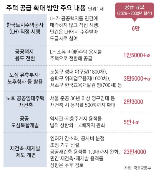 서울 도심 내에 있는 국공유지, 유휴부지에 생활시설과 주택을 복합개발해 4000채를 공급하겠다는 계획도 내놨다. 구체적으로는 도봉구 성대 야구장(1800채), 송파구 위례업무용지(1000채), 서초구 한국교육개발원(700채) 등이 해당한다. 서울 서초구 서리풀(2만 채), 경기 과천(1만 채) 등 서울 남부권 신규 공공택지는 2029년 착공에 맞춰 사업을 추진한다. 또 지난해 8·8 공급 대책에서 밝힌 그린벨트 해제를 통한 8만 채 추가 공급 중 3만 채 규모 택지는 올해 안에 추가 발표할 예정이다.