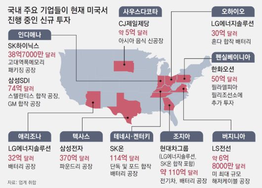 7일 재계에 따르면 현재 미국 내에 투자를 발표하고 생산 시설을 건설 중이거나 가동을 준비 중인 한국 기업은 LG에너지솔루션과 현대차그룹을 비롯해 삼성전자 SK하이닉스 등 반도체 기업, SK온 삼성SDI 등 배터리 기업과 LS전선 CJ제일제당 등이 있다.