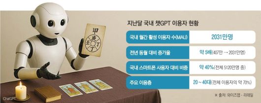 사주부터 타로, 심리상담, 무의식 분석까지 챗GPT의 활용 범위가 다양해지면서 사용자 또한 빠르게 증가하고 있다. 7일 와이즈앱·리테일에 따르면 지난달 챗GPT의 국내 월간 활성 이용자 수(MAU) 추산치는 2031만명으로 전년 동월(407만명) 대비 약 5배 늘었다. 국내 스마트폰 사용자 5120만명의 약 40%에 해당하는 수치다. 이 중 20대부터 40대까지가 전체 사용자의 약 70%를 차지하는 주요 이용층으로 나타났다.