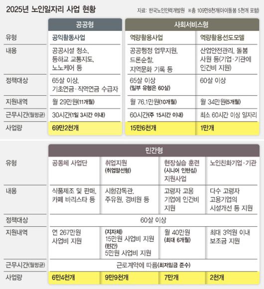 노인일자리는 그 유형에 따라 크게 공공형과 사회서비스형, 민간형으로 나뉜다. 여전히 가장 큰 비중은 기초연금 수급자를 대상으로 하는 공공형(69만2천개, 전체의 63%)이다. 사회서비스형과 민간형은 최저임금이 준수되고 사회보험이 적용되는 일자리 성격이 강한 반면, 공공형은 업무 강도가 낮은 자원봉사 형태로 참여수당을 받는 복지사업에 가깝다.