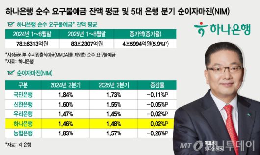 하나은행 순수 요구불예금 잔액 평균 및 5대 은행 분기 순이자마진(NIM)/그래픽=김지영 |