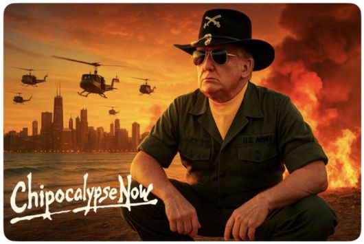그림엔 영화 원제 '아포칼립스 나우'(Apocalypse Now)와 시카고를 합쳐 '치포칼립스 나우'(Chipocalypse Now)라고 적었다. 그 뒤론 시카고 상공에 군용 헬기가 비행하고 폭발이 발생한 듯한 배경을 담았다.