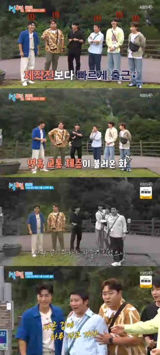 김종민은 당일 퇴근이 안 될 것 같다고 했다. 조세호 역시 "나온 김에 하루 자고 가자"고 말했고 문세윤도 동참하면서 당일 퇴근 반대파가 결성됐다.