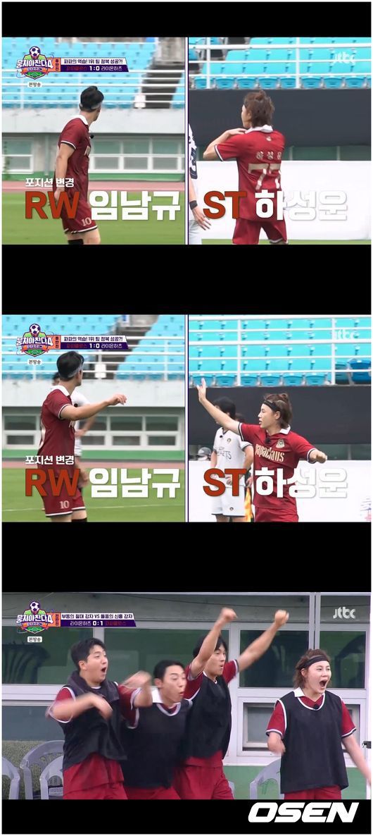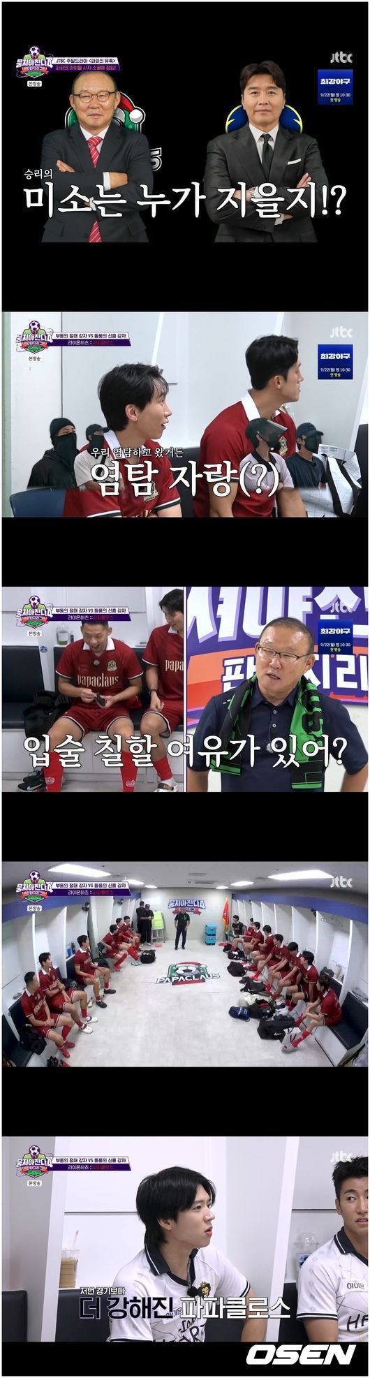 7일 방영한 JTBC 예능 '뭉쳐야 찬다4’에서는 1위인 이동국 감독의 라이온하츠 FC와 3위인 박항서 감독의 FC파파클로스가 맞붙었다. 라이온하츠는 1위지만 살짝 부진했고, 파파클로스는 무섭게 치고 올라오는 팀이었다. 이런 팀들을 보며 4위인 김남일은 “싹스리 우리 선수들이 경기를 통해서 자신감을 찾아가는 것 같고, 주문한 걸 잘하는 거 같아서 우리가 발전한 거 같지 않냐”라며 희망을 잃지 않는 소리를 해 김성주에게 타박을 들었다.