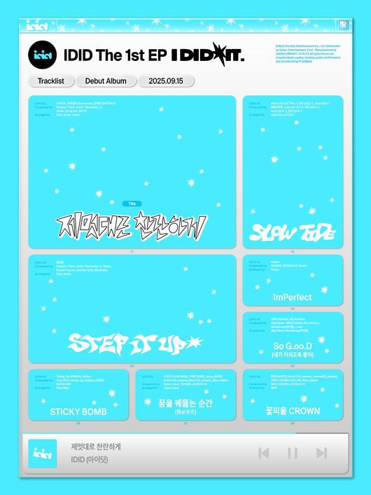 스타쉽은 지난 7일 아이딧(IDID·장용훈, 김민재, 박원빈, 추유찬, 박성현, 백준혁, 정세민)의 첫 번째 미니 앨범 ‘아이 디드 잇.(I did it.)’의 트랙 리스트를 공개했다. 아이스 블루 무드의 스킨으로 이뤄진 트랙리스트는 음악 재생 프로그램의 팝업창 느낌으로 하이틴 감성을 채워 '세상에서 단 하나뿐인' 아이딧(IDID)만의 청량미를 완성했다.