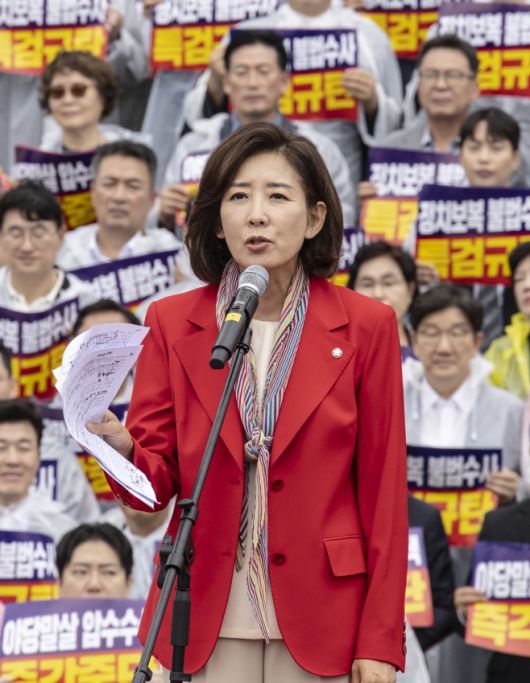 국민의힘 나경원 의원이 4일 국회 본청 계단에서 열린 야당말살 정치탄압 특검수사 규탄대회에서 민주당을 규탄하는 내용의 연설을 하고 있다./연합뉴스 |