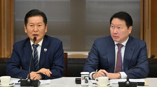 정청래(오른쪽) 더불어민주당 대표와 최태원 대한상의 회장이 8일 오전 서울 중구 대한상공회의소에서 열린 더불어민주당-대한상공회의소 정책 간담회에 참석하고 있다. 임세준 기자 |
