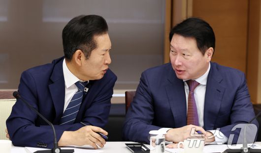 정 대표는 "지금 세계 경제는 격랑 속에 있다. 하지만 변화에 부합하지 못해 기업 활동을 저해하는 낡은 법적, 제도적 장치가 여전하다"며 "최 회장이 말한 기업 사이즈별 계단식 규제를 피하느라 성장도 피한다는 지적이 가슴에 와닿는다"고 말했다.