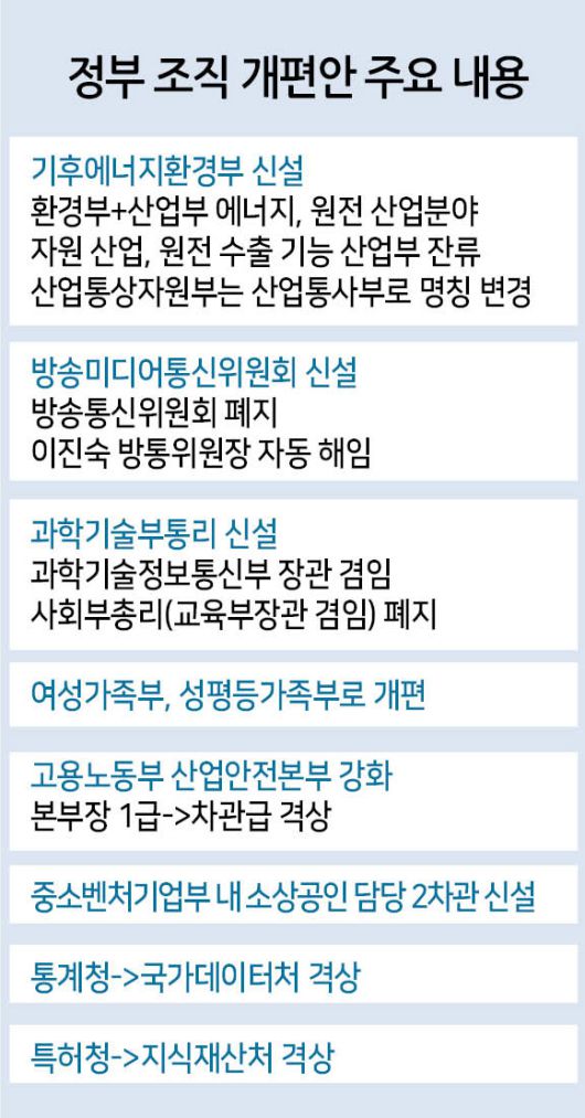 더불어민주당과 정부, 대통령실은 기획재정부를 재정경제부와 기획예산처로 분리하고 환경부를 기후에너지환경부로 확대 개편하는 걸 골자로 하는 정부조직 개편안을 확정했다. 2008년 폐지된 과학기술부총리 직제도 17년 만에 부활한다. 이로써 중앙행정기관은 기존의 19부 3처 20청 6위원회에서 19부 6처 19청 6위원회로 바뀌게 된다. 민주당은 이같은 내용을 담은 정부조직법 개정안을 조만간 발의하고 오는 25일 본회의에서 처리하겠다는 계획이다. 정부조직법 개정에 발맞춰 금융위원회법, 검찰청법 등 세부 입법도 추진한다. ▶관련기사 21면