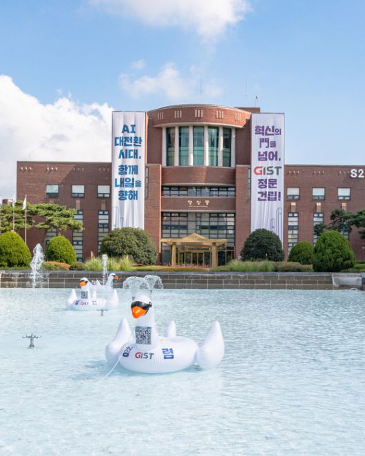 GIST 행정동 앞 분수대에 설치된 '청렴 백조(淸廉潔白鳥)' 조형물. |