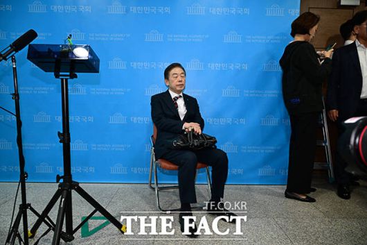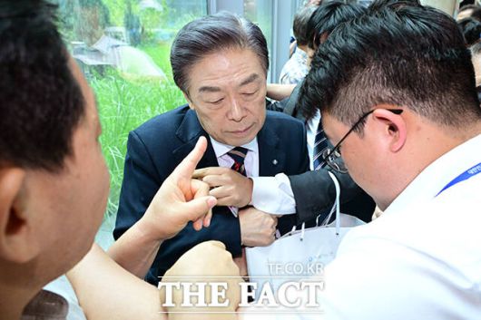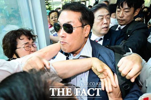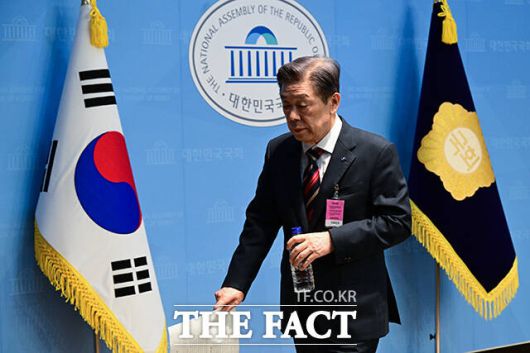 [더팩트ㅣ국회=남윤호 기자] 김형석 독립기념관장이 8일 서울 여의도 국회 소통관에서 기자회견장으로 이동하던 중 사퇴를 촉구하는 시민단체 회원들에게 항의를 받고 있다.
