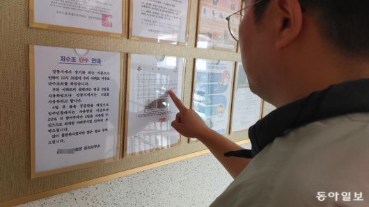 8일 강릉의 한 아파트 안내판에 단수 안내문이 붙어있다. 강릉시는 6일부터 아파트와 숙박시설 등 대수용가에 대해 강화된 제한급수를 시행하고 있다. 강릉=이인모 기자 imlee@donga.com |
