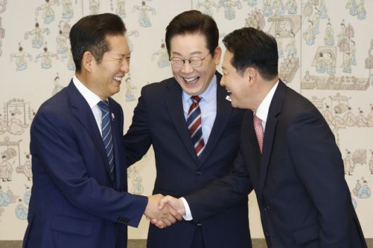 아시아투데이 홍선미 기자 = 이재명 대통령은 8일 용산 대통령실에서 정청래 더불어민주당 대표, 장동혁 국민의힘 대표와 오찬 회동을 갖고 '상생의 정치', '모두가 사는 정치'를 위해 자주 소통하겠다는 의지를 드러냈다.