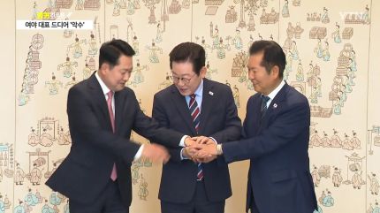 이어서 손짓을 하자 정청래 민주당 대표와 장동혁 국민의힘 대표도 웃으며 악수를 나눕니다.