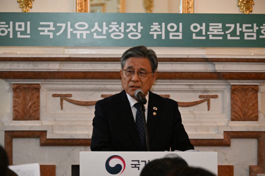 허민 국가유산청장이 8일 서울 중구 덕수궁 석조전에서 취임 기자간담회를 하고 있다. [국가유산청] |