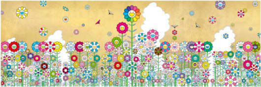 1995년부터 그의 작품에서 지속적으로 등장해온 활짝 웃는 꽃에는 작가의 ‘슈퍼플랫(Superflat)’ 철학이 담겨 있다. 슈퍼플랫은 ‘평평한’ 이차원적 이미지를 통해 고급과 저속의 구분이 거의 없는 전후 일본사회의 천박한 문화와 공허한 소비주의, 성적 페티시즘, 성장에 대한 공포 등을 비판하기 위해 무라카미가 약 20년 전 창안한 미술사조다. 일본의 전통회화 양식인 니혼가와 만화·애니메이션에서 모두 영감을 받았다. 강박적인 성향의 서브 컬처를 일컫는 ‘오타쿠’와 일본어로 귀엽다는 의미의 ‘카와이’ 감성을 복합적으로 반영한 것이 특징이다.