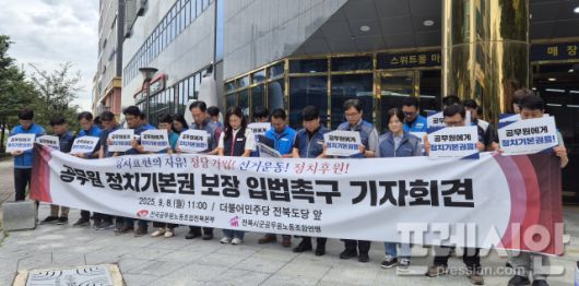 전국공무원노조 전북본부 등은 8일 오전 더불어민주당 전북도당 앞에서 기자회견을 열고 “교원과 공무원도 국민으로서 정당 가입과 정치적 의사 표현의 권리를 보장받아야 한다”고 주장했다.