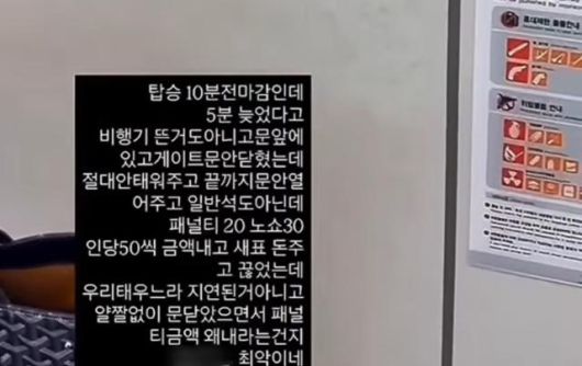 8일 다수의 온라인 커뮤니티에 따르면, 발단은 한 국적 항공사의 잘못을 주장하는 내용의 지난 6일 자 게시물이었다. 글쓴이인 여성 승객 A씨는 당시 상황을 담은 영상과 함께 "탑승 10분 전 마감인데 5분 늦었다고, 비행기 뜬 것도 아니고 문 앞에 있고, 게이트 문 안 닫혔는데 절대 안 태워 준다"며 "끝까지 문 안 열어 준다"고 적었다. 이어 "일반석도 아닌데 (중략) 우리 태우느라 지연된 것 아니고 얄짤없이 문 닫았으면서 페널티 금액 왜 내라는 건지 최악"이라고 덧붙였다.