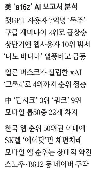 상반기에는 한국의 생성형 AI 검색 스타트업 라이너가 19위를 기록하며 미국 등 해외에서의 성장세를 보여주었으나, 하반기에는 순위가 55위로 밀리면서 아슬아슬하게 50위권을 놓쳤다. 웹 기반 서비스에서는 챗GPT, 딥시크, 클로드처럼 챗봇 형식의 AI 어시스턴트가 주류를 이루는 가운데 한국은 라이너 등 일부 스타트업을 제외하고는 이렇다 할 서비스가 없기 때문인 것으로 보인다.