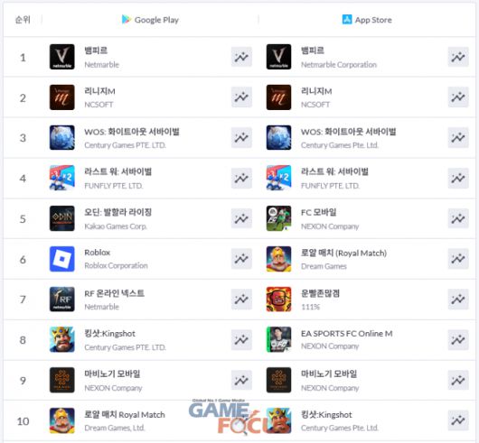 이외에는 큰 변화 없는 유사한 흐름이 이어지고 있다. '리니지M'이 양대 앱 마켓 모두 2위로 '뱀피르'의 뒤를 추격하는 한편, '화이트아웃 서바이벌'과 '라스트 워: 서바이벌' 그리고 '오딘: 발할라 라이징' 등이 TOP 5에서 순항 중이다. TOP 10에서도 '마비노기 모바일', '로얄 매치', '킹샷' 등 매출 순위가 높았던 게임들이 자리하고 있다.