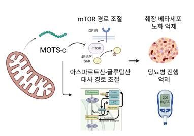 MOTS-c가 mTOR 및 아스파르트산–글루탐산 대사 경로를 조절해 췌장 베타세포 노화를 억제하고, 인슐린 기능을 보존함으로써 당뇨병 진행을 늦추는 기전 모식도.[사진=서울대병원] |