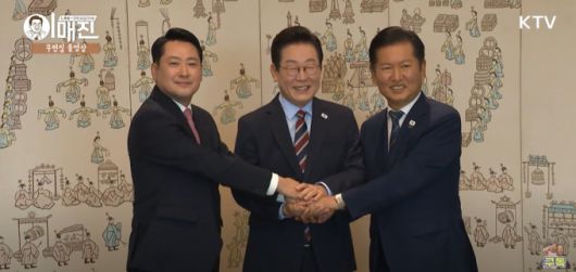 이재명 대통령과 정청래 더불어민주당 집권 여당 대표, 장동혁 국민의힘 제1야당 대표가 8일 용산 대통령실에서 오찬 간담회를 했다. [출처=KTV 화면] |