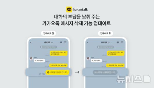 [서울=뉴시스] 카카오가 12일 카카오톡 업데이트를 진행했다. 메시지 삭제 가능 시간을 기존 5분에서 최대 24시간 내로 확대했으며 삭제된 메시지 표기 방식을 기존 말풍선 형식에서 피드 표기 방식으로 변경해 삭제한 사람이 누구인지 특정되지 않도록 했다. 2025.08.12. (사진=카카오 제공)