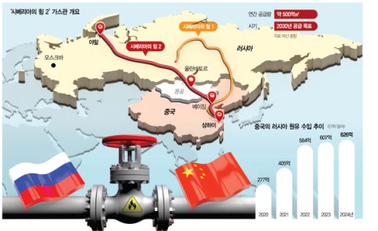 중국의 러시아에 대한 채권시장 재개방은 반미·반서방을 내걸고 있는 양국 간 에너지 결속이 구체화하고 있다는 의미로 읽힌다. 중국은 우크라이나 전쟁을 거치며 이미 러시아 원유의 최대 ‘큰손’이 됐다. 2023년 러시아가 중국에 수출한 원유는 2021년에 비해 30% 이상 증가했다. 더 나아가 러시아는 중국을 ‘탈(脫)러시아산 가스’를 선언한 유럽연합(EU)의 대체 시장으로 삼고 있다. 시진핑 중국 국가주석과 블라디미르 푸틴 러시아 대통령은 이달 2일 중국 베이징에서 열린 정상회담에서 ‘시베리아의 힘 2 프로젝트’ 건설에 대한 ‘법적 구속력이 있는’ 협약을 맺었다. ‘시베리아의 힘 2’는 러시아 야말반도에서 몽골 울란바토르를 거쳐 중국 동남부 상하이까지 잇는 거대한 천연가스관으로 완공 시 가스 공급 규모는 총 500억 ㎥에 달할 것으로 추산된다. ‘시베리아의 힘 1(2019년 가동 시작)’은 총길이 5000㎞ 이상, 연간 가스 공급량은 1억 3000만 가구가 사용 가능한 380억 ㎥ 수준이었다. 그간 가스 공급 가격과 가스관 건설 비용 등 문제로 ‘시베리아의 힘 2’ 건설에 소극적이었던 중국이 적극적인 태도로 선회하며 러시아로서는 든든한 자금줄을 확보하게 됐다는 평가가 나온다. 푸틴 대통령은 이번 정상회담에서 기존 ‘시베리아의 힘 1’ 가스 공급량을 연 380억 ㎥에서 440억 ㎥로 늘리고 극동 가스관의 가스 수송을 연 100억 ㎥에서 120억 ㎥로 늘리겠다는 중국 측 약속도 받아냈다.