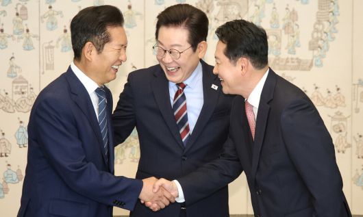 이재명 대통령과 정청래 더불어민주당 대표, 장동혁 국민의힘 대표가 8일 용산 대통령실에서 만나 ‘민생경제협의체’를 구성하기로 합의했다. 그동안 공식 석상에서 인사도 하지 않았던 정 대표와 장 대표는 이날 처음 악수하며 관계 개선의 물꼬를 텄다. 이 대통령은 여야 지도부와 오찬 회동 뒤 장동혁 대표와 별도로 양자 회동을 했다.