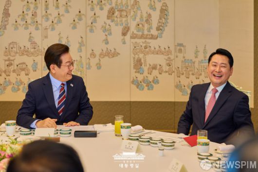 [서울=뉴스핌] 이재명 대통령(왼쪽)이 8일 서울 용산 대통령실에서 열린 여야 지도부 오찬 회동에서 장동혁 국민의힘 대표와 미소를 짓고 있다. [사진=대통령실] 2025.09.08 photo@newspim.com