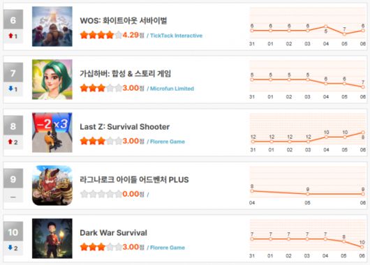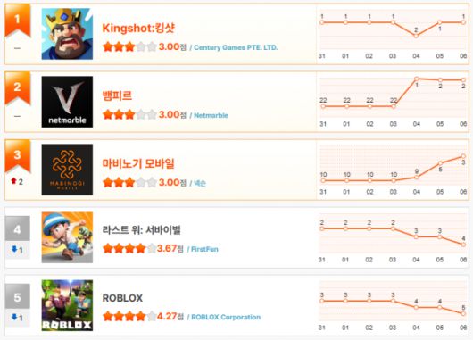 이 와중에 ‘마비노기 모바일’이 대규모 업데이트 효과를 톡톡히 누리며 지난주 10위에서 이번 주 3위까지 순위를 끌어올렸다. 반면, 상위권을 지키던 ‘라스트워: 서바이벌’과 ‘로블록스’는 각각 4위와 5위로 한 계단씩 밀려났다. ‘WOS: 화이트아웃 서바이벌’은 6위를 유지했으며, ‘가십하버: 합성 & 스토리 게임’은 7위로 다소 하락했다.