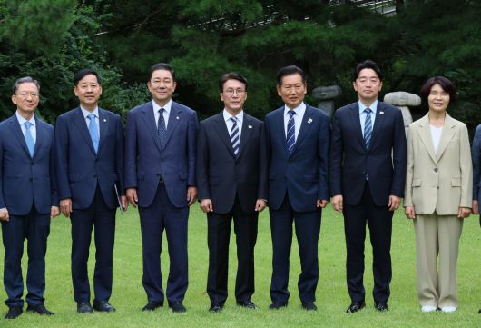 김민석 국무총리(가운데)가 지난 7일 서울 종로구 국무총리공관에서 열린 고위당정협의회에서 참석자들과 기념촬영을 했다. 왼쪽부터 정성호 법무부 장관, 구윤철 부총리 겸 기획재정부 장관, 김병기 더불어민주당 원내대표, 김 총리, 정청래 더불어민주당 대표, 강훈식 대통령비서실장, 한정애 더불어민주당 정책위의장. 연합뉴스 |