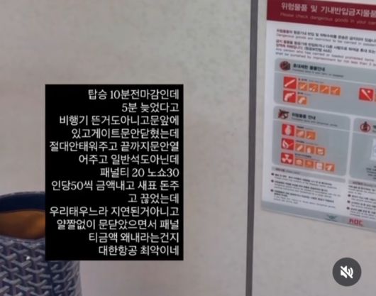 그러면서 “페널티 20만원, 노쇼 30만원 등 1인당 50만원씩 금액 내고 새 표 끊었다”라며 “우리 태우느라 지연된 거 아닌데 얄짤 없이 문 닫았으면서, 페널티 금액 왜 내라는 건지? 대한항공 최악이다”라고 분통을 터뜨렸다.