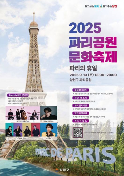 서울 양천구(구청장 이기재)는 오는 13일 파리공원에서 프랑스의 감성을 담은 ‘2025 파리공원 문화축제’를 개최한다. 한·불 수교 100주년을 기념해 조성된 파리공원에서 프랑스 음식과 음악, 놀이를 체험하며 가족과 함께 특별한 하루를 보낼 수 있는 지역 대표 축제다.