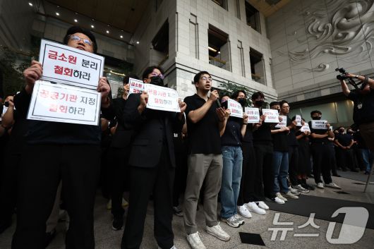 (서울=뉴스1) 김민지 기자 = 금융감독원 노동조합 조합원들이 9일 오전 서울 여의도 금융감독원 로비에서 금감원 내 금융소비자보호처 분리 및 공공기관 지정 등 최근 금융감독체계 조직 개편 반대 시위를 하고 있다. 2025.9.9/뉴스1kimkim@news1.krCopyright ⓒ 뉴스1. All rights reserved. 무단 전재 및 재배포, AI학습 이용 금지.