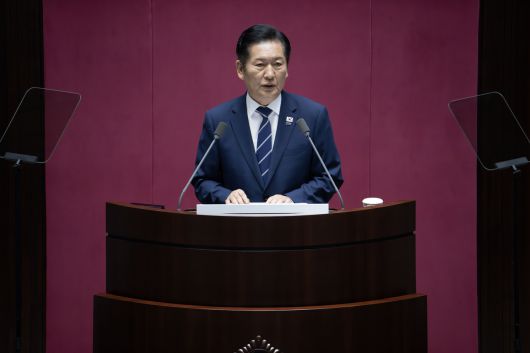 정청래 더불어민주당 대표가 9일 오전 서울 여의도 국회에서 열린 본회의에서 교섭단체 대표연설을 하고 있다. 임세준 기자 |