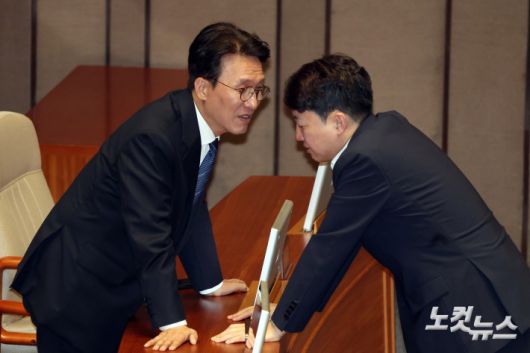 9일 서울 여의도 국회에서 열린 제429회국회(정기회) 제2차 본회의에서 김민석 국무총리와 개혁신당 이준석 대표가 대화를 하고 있다.