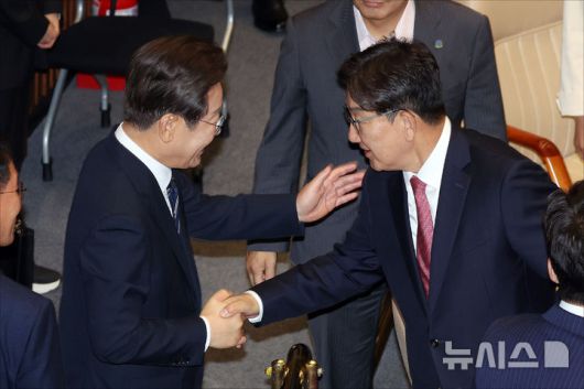 [서울=뉴시스] 국회사진기자단 = 이재명 대통령이 26일 오전 서울 여의도 국회에서 열린 제426회국회(임시회) 제2차 본회의에서 2025년도 제2회 추가경정예산안에 대한 정부의 시정연설을 마친 뒤 권성동 국민의힘 의원과 인사하고 있다. 2025.06.26. photo@newsis.com |