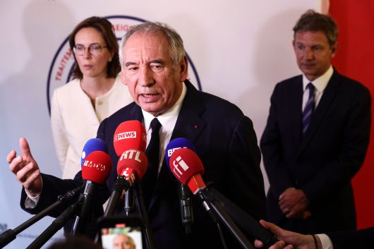 프랑수아 바이루 프랑스 총리(가운데)가 7월 31일 파리 외곽 몽트뢰유의 금융조사기관 트라핀(Tracfin)을 방문한 뒤 아멜리 드 몽샬랭 공공계정 담당 장관(왼쪽), 앙투안 마냐 트라핀 국장(오른쪽)과 함께 기자들에게 발언하고 있다. 바이루 총리는 재정 악화로 인해 공휴일 축소·복지 동결 등을 담은 긴축 예산안을 내놓은 상황이다. /EPA·연합뉴스 |