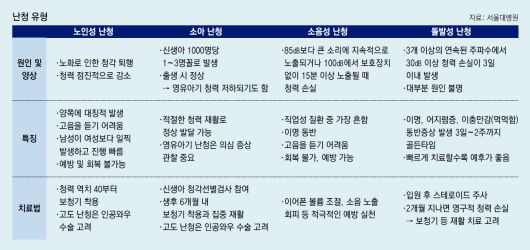 난청은 노인성 난청, 소아 난청, 돌발성 난청, 소음성 난청 등 원인과 발생 양상에 따라 다양하다. 그중에서도 노인성 난청은 65세 인구 10명 중 3명이 겪을 만큼 흔하며 관절염, 고혈압에 이어 세 번째로 많이 발생하는 노인성 질환으로 꼽힌다. 최근에는 작업환경의 소음과 과도한 이어폰·헤드폰 사용으로 인한 소음성 난청도 증가하고 있으며 국내 인구 100명 중 약 2명은 소음성 난청을 경험한 것으로 알려졌다.
