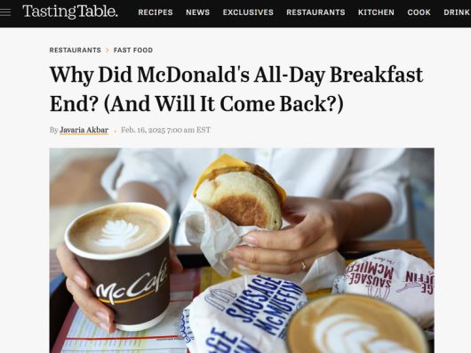 미국 음식 정보 플랫폼 ‘테이스팅테이블’이 올해 2월 게재한 ‘왜 맥도날드의 올데이 브렉퍼스트는 사라졌을까’ 기사. 캡쳐ㅣ테이스팅테이블 홈페이지 |