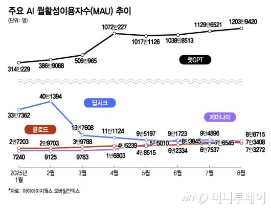 그사이 챗GPT의 이용자는 대폭 늘었다. 1월 314만여명이었던 MAU는 8월 1203만9420명에 달해 7개월 만에 4배 급증하며 국내 시장을 사실상 독식했다. 이달 초 새롭게 출시된 GPT-5에 대한 호불호가 갈리는 상황에서도 8월 MAU 숫자는 전월(1129만6521명) 대비 74만명 증가했다.