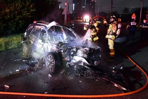 음주운전 헌터 유튜버의 추적을 받다가 추돌사고로 불길에 휩싸인 차량. [사진 = 광주 광산소방서] |