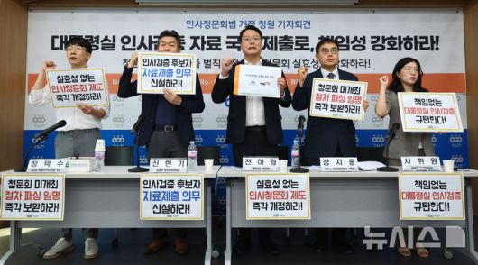 이들은 "대통령실의 검증 과정과 결과가 국회에 공유되지 않아 기본 사실관계조차 청문회에서 다시 확인해야 한다"며 "국회가 요구하는 자료도 후보자가 거부하면 기관도 연쇄적으로 제출을 회피한다. 이 구조가 자료 누락·허위 제출·소명 지연을 방치하여 검증 실패로 이어지고 있다"고 진단했다.