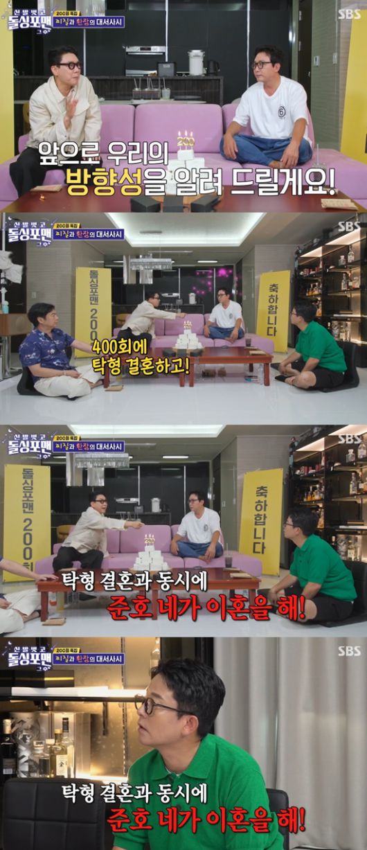 이상민은 "제가 원하는 게 있다. 프로그램의 방향성을 이야기하겠다. 200회에 원희 형 결혼하고 400회에 재훈 형 결혼하고 400회에 김준호가 이혼을 해라"라며 김준호에게 이혼을 제안했다.