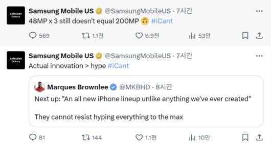 삼성전자 미국법인 공식 X(전 트위터) ‘삼성 모바일 US’는 10일 “4800만 화소 카메라 3개는 여전히 2억 화소와 동등하지 않다”는 글과 함께 ‘#iCant’를 해시태그로 올렸다. 여기서 ‘iCant’는 아이폰(iPhone)은 할 수 없다(Can’t)는 뜻으로 보인다.