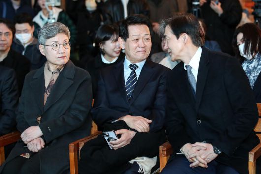 2024년 2월 당시 조국 전 법무부 장관이 서울 동작구 아트나인&잇나인에서 열린 일명 ‘조국신당’ 창당준비위원회 출범식에서 은우근 공동 창당준비위원장(가운데)과 대화를 나누는 모습. (뉴스1 DB) 2024.2.15/뉴스1 ⓒ News1 |
